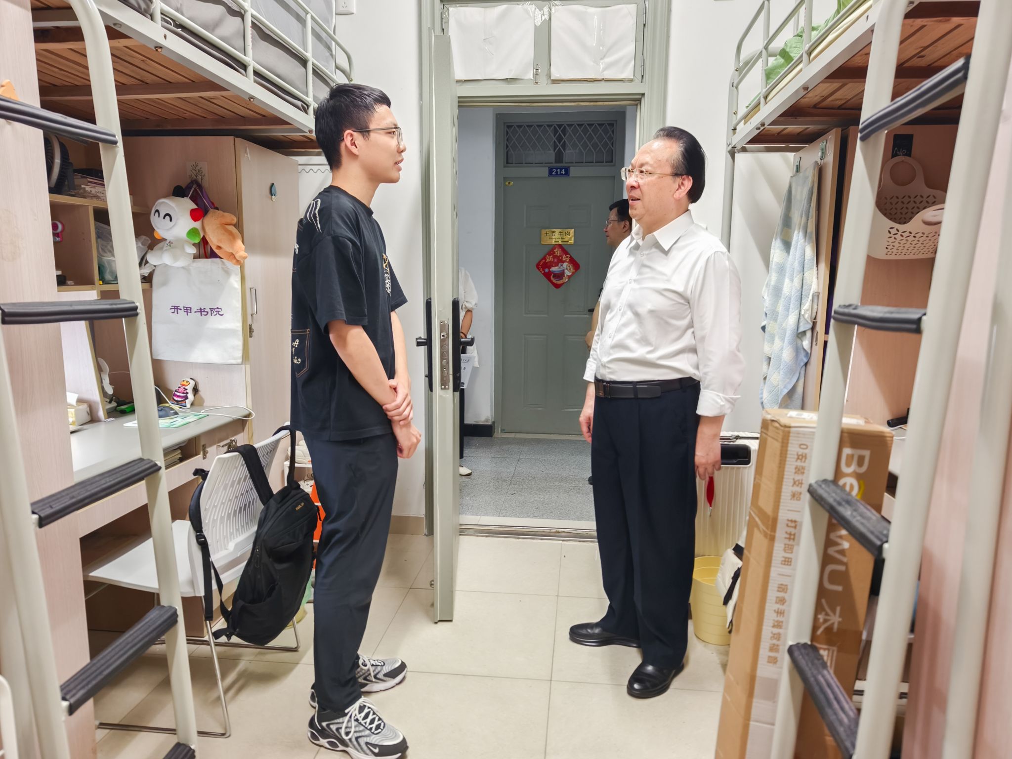 在南园2舍,开甲书院2024级本科生正在忙碌地打包行李。谭铁牛关切询问了同学们的搬家计划,叮嘱他们在搬运重物时要量力而行,注意安全。