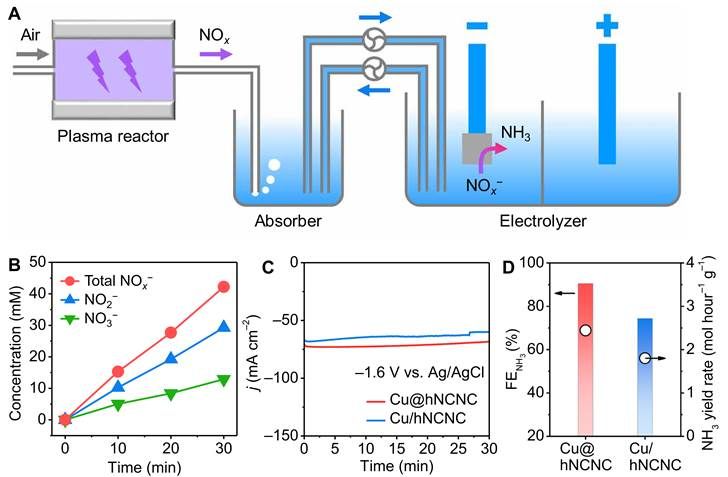 图4. 等离子体氮气氧化-硝酸盐还原耦合系统的可持续制氨演示。(A)耦合系统示意图。(B)硝酸盐/亚硝酸盐浓度随等离子体处理时间变化曲线。(C)恒电压模式下的i-t曲线。(D)产氨性能对比。