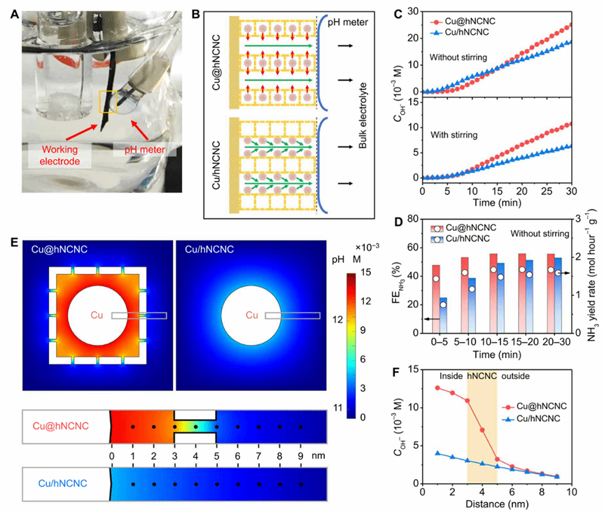 图2. 局域pH检测及模拟。(A、B)pH计法检测OH?的产生和扩散的实物图(A)和示意图(B)。(C)电极表面OH?浓度随时间变化图。(D)不同反应时段的产氨性能。(E、F)笼内外OH?浓度的有限元模拟。