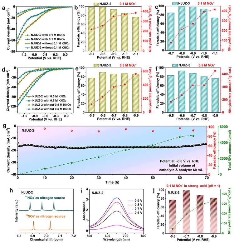 图3(a,d)分别显示了在不同浓度硝酸盐电解质中测试的电极的线性扫描伏安法(LSV)曲线,表明NJUZ-2和NJUZ-3对硝酸盐物种具有不同的电催化活性。在对应的电解质中,在-0.7至-1.1 V的过电势范围内(相对于可逆氢电极,RHE)进行了NITRR测试。随着施加电位的增加,NJUZ-2和NJUZ-3在0.1 M KNO3下测试结果呈现火山状曲线,其中在-0.8 V vs. RHE时达到最大值(图3(b-c))。此外,我们还研究了高浓度硝酸盐电解质对NITRR性能的影响(图3(e-f))。在0.5 M KNO3水溶液中测试的FE参数方面,NJUZ-2和NJUZ-3电极的活性略低。耐久性是评估长期电化学反应中催化稳定性的关键参数。图3g显示了NJUZ-2在连续65小时计时电流法测试中NH3的稳定积累,电流密度或FE没有明显下降(即电催化活性和选择性保持稳定)。这表明在长期NITRR工艺中具有出色的耐用性。然而,从65小时开始,I-t曲线显示出轻微的上升趋势,表明催化活性略有减弱。