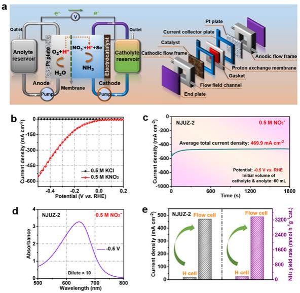 在这项工作中,我们设计了一个流动池系统用于进行工业电流密度电催化硝酸盐测试,如图5a所示。在0.2 V至-0.5 V(vs. RHE)的施加过电势范围内,与在0.5 M KCl电解质中获得的电流密度相比,在0.5 M KNO3电解质中测量的NJUZ-2的线性扫描伏安法(LSV)曲线显示出显著增强的电流密度,从而验证了NITRR过程的发生(图5b)。如图5c所示,在-0.5 V vs. RHE下运行0.5小时期间,进一步测试了NJUZ-2的随时间变化的电流密度曲线,计算出的平均总电流密度为469.9 mA cm-2。图5d显示了稀释10倍并用靛酚指示剂着色的NITRR产物的相应紫外-可见吸收光谱。值得注意的是,流动池中的NJUZ-2电催化剂实现了3370.6 mmol h-1 g-1cat的高NH3收率。如图5e所示,与传统H型电解池相比,增加了20.1倍。同时,流动池中的运行电流密度是H型池中的27.1倍。