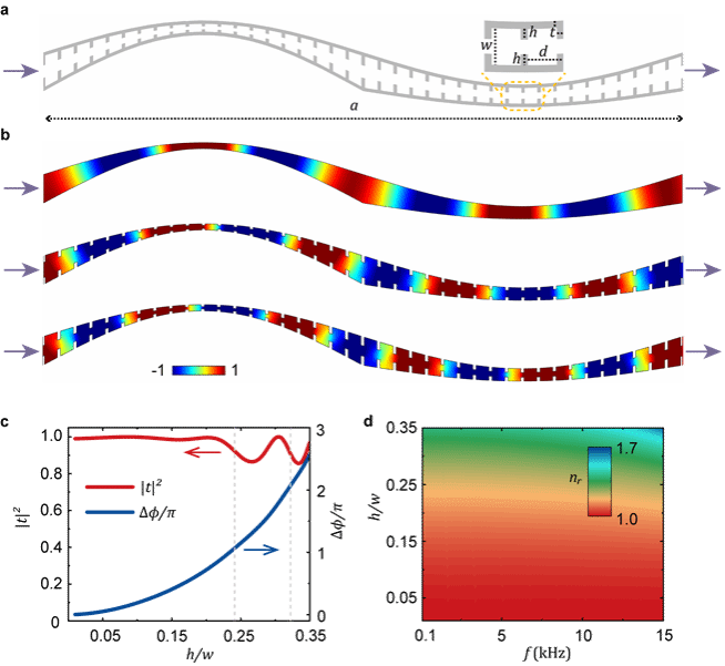 在这项研究中,研究人员创新性地采用了亚波长尺度的声学隧道作为超构材料的基本单元结构,并隧道内部设计了一系列倒刺结构,如图1所示。这些具有倒刺结构的特殊声学隧道的核心功能在于其对声速的任意操控能力,且能保持高效的传输效率。由于结构的非共振特性,其工作机制适用于超宽频带。幻像器件由一系列声隧道组成,这些隧道巧妙地环绕着预设的障碍物。为了实现超宽频带范围内的隐形时空幻像,两个核心条件需要满足:第一,器件的入射面和出射面的几何形态保持一致;第二,所有声隧道具有完全相同的声程。