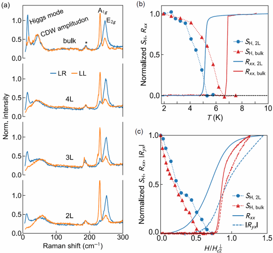 图2. (a) 不同厚度样品超导态的拉曼光谱。(b) 双层及块体样品希格斯模谱权重与纵向电阻温度依赖对比。(c) 双层及块体样品希格斯模谱权重与纵向、霍尔电阻磁场依赖对比。