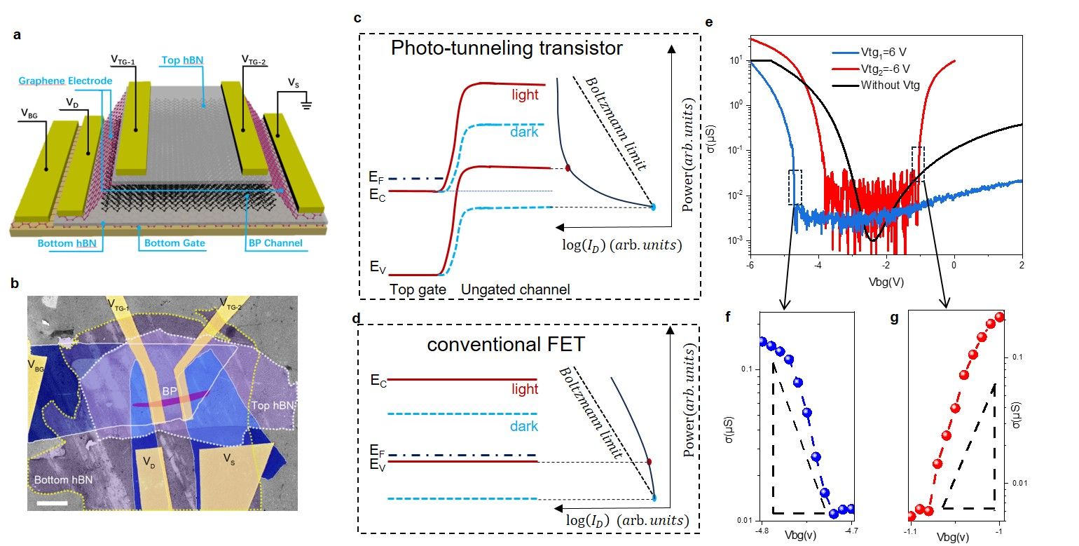 图2:黑磷(BP)光隧穿晶体管。a.器件结构示意图,展示BP沟道、石墨烯接触电极(源极Vs与漏极Vd)、底栅(Vbg)、两个部分顶栅(Vtg1与Vtg2)以及六方氮化硼(hBN)介质层。b.图(a)中典型器件的扫描电子显微镜(SEM)伪彩照片,彩色虚线标注器件不同层结构:黄色为底层hBN,白色为顶层hBN,实线白框标示底栅电极,比例尺为10微米。c和d分别展示不同光晶体管工作原理的能带示意图,具体描绘了光隧穿晶体管与传统场效应晶体管(FET)在暗态(蓝色虚线)与光照(红色实线)下的情况。采用带间隧穿(热电子)电荷注入机制时,器件具有陡峭(平缓)的亚阈值摆幅(SS)并对弱光产生(无)响应。Id表示源漏电流,Ef为费米能级,Ev代表BP沟道价带能量。e.图(b)器件在室温下不同工作模式的转移特性曲线。无顶栅电压(Vtg)时表现为双极型FET(黑色曲线);当Vtg1=6V(Vtg2=-6V)时,器件配置为p型(n型)隧穿晶体管(Vds=0.1V)。f和g为隧穿晶体管模式的放大转移曲线,虚线三角标示SS=60mV/dec的亚阈值斜率作为对比基准。