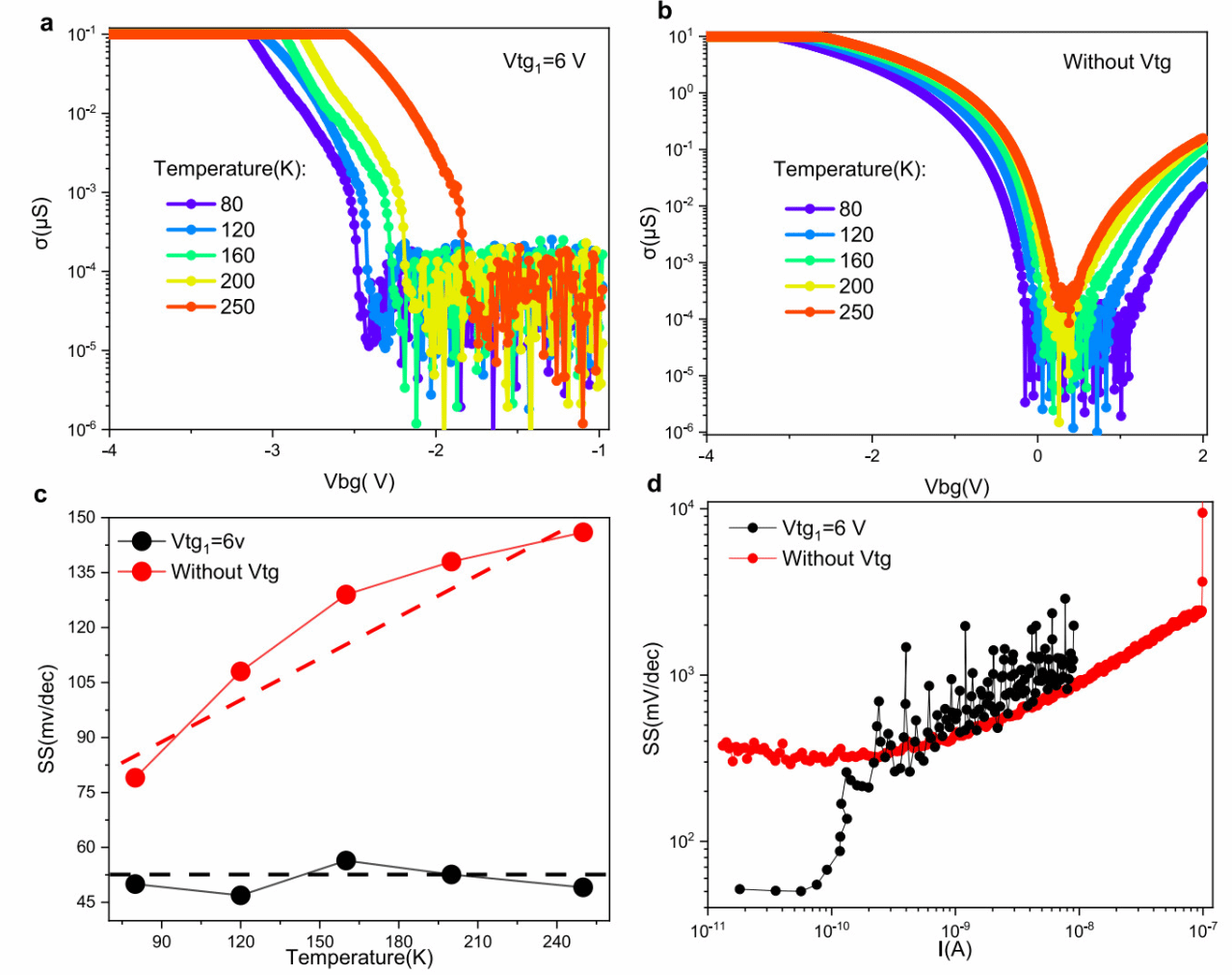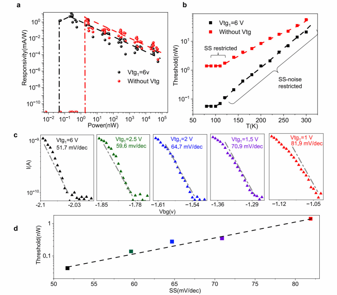 图4:亚阈值摆幅(SS)与开启阈值的关联性。a.通过光响应测量提取的传统FET(红色)与光隧穿晶体管(黑色)响应度对比,显示光隧穿晶体管具有更优的阈值功率但响应度较低。b.实测传统FET(红色)与光隧穿晶体管(黑色)的阈值功率随温度变化关系,曲线可划分为两个特征区域,揭示了电荷注入机制对阈值功率的决定性作用。c.不同顶栅电压(Vtg1)下器件的转移特性曲线,显示SS随Vtg1连续调控,灰色虚线标示SS=60mV/dec的参考斜率(Vds=0.1V)。d.对应(c)中配置的实测阈值功率与SS的函数关系。