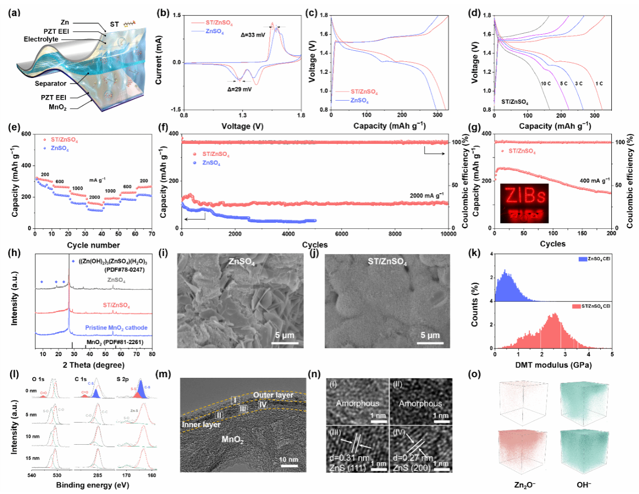 近日,凯发k8官网姚亚刚教授团队提出了一种简便且可规模化的工程策略,通过在ZnSO?电解液中引入硫辛酸钠(ST)分子,在电极与电解质之间构建稳定的双层界面。ST分子具有良好的亲锌性,首先通过调控水合Zn??离子的溶剂化结构,部分置换其水合鞘中的H?O分子,从而优化电解液环境,有效抑制腐蚀并削弱析氢反应。随后,ST阴离子在Helmholtz内层上的特异吸附重构了电双层结构,促进Zn??的脱溶,并通过其捕获Zn??的能力实现界面电荷分布的均匀化。在吸附过程中,界面上的ST分子发生原位聚合,形成由ZnS–有机无定形内层和聚合态硫辛酸锌外层组成的双层结构。其中,内层调节Zn??的离子通量,外层则增强界面的机械强度。值得一提的是,ST分子中的二硫键可发生动态断裂与重组,使聚合界面具备自修复能力,能够修复损伤,并进一步提升电极-电解质界面的自调节性与适应性。凭借这一独特设计,ST增强的锌对称电池在60mAcm??高电流密度下实现了长达7800圈的超长循环寿命;同时,组装的锌锰全电池在2000mAg??下经过10,000圈循环后容量衰减率仅为0.0014%。这一双层界面工程策略为实现长寿命锌锰全电池的发展提供了重要突破。