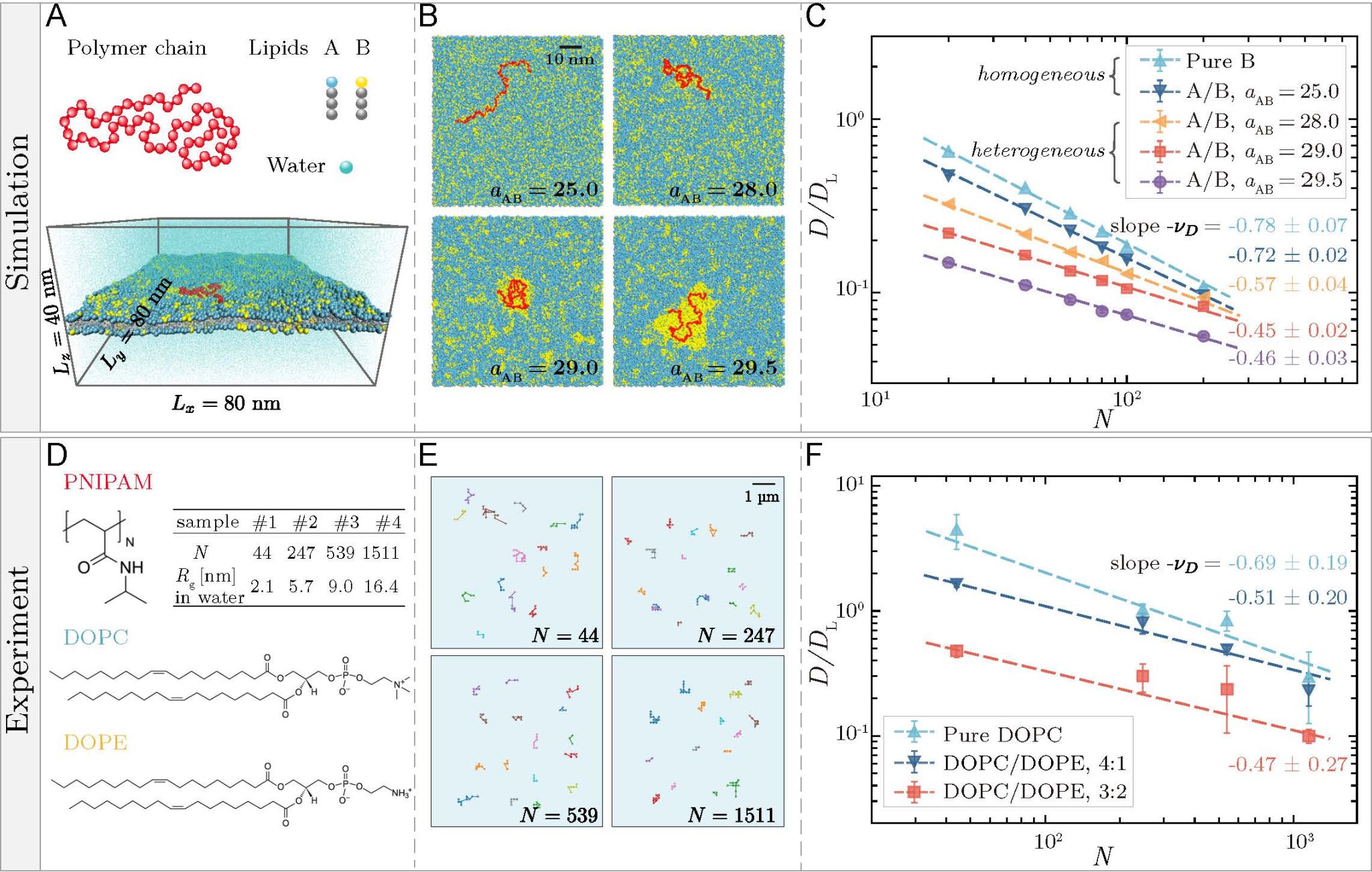 图 1:大尺度流体力学模拟与单分子示踪实验揭示高分子在异质膜上的新扩散规律。