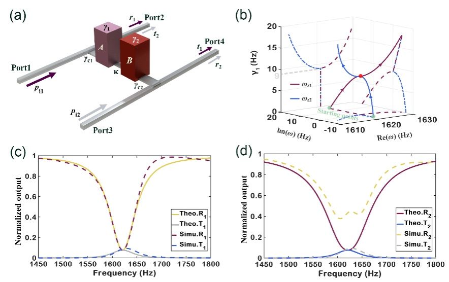 作为非厄米物理的核心概念之一,奇异点是通过精确调控系统的损耗或增益所形成的特殊本征简并态,因其所表现出的异常灵敏度特性,在量子力学、光学和声学传感领域具有重要应用价值。当奇异点与波动体系的零点在复平面上重合时,系统将表现出相干完美吸收这一独特的非厄米效应。然而,在经典波体系中,非厄米系统的关键参数(如本征频率、非厄米损耗等)通常受其物理本质制约而相互耦合,使得奇异点的精准调制面临巨大挑战。尤其是在声学领域,由于波长尺度相对较大,且传统静态波导系统难以实现非厄米参数的解耦调控,因此如何精准激发声相干完美吸收奇异点目前仍是一个亟待解决的难题。