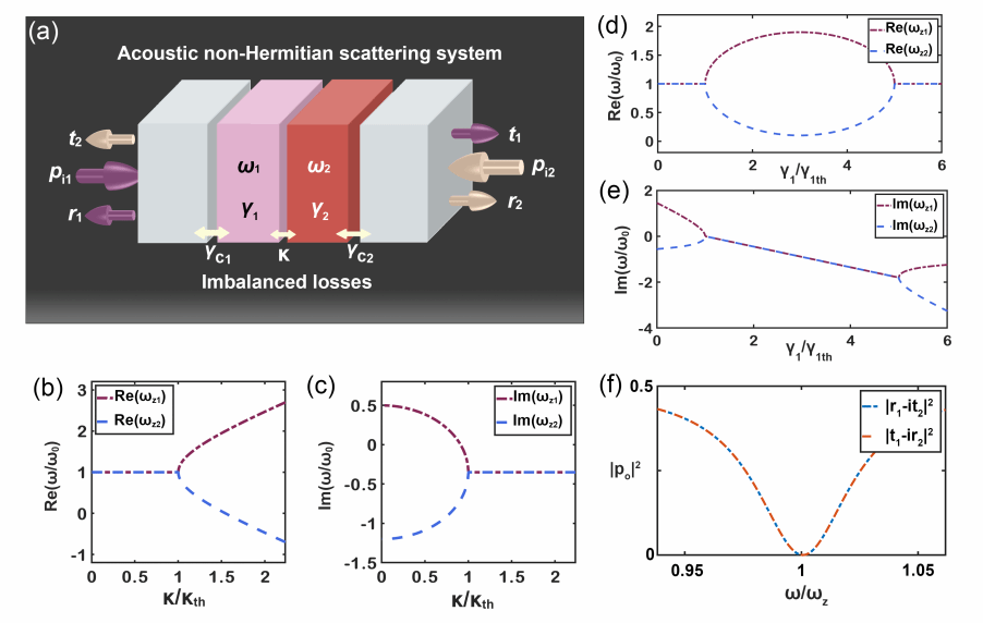 图1. (a)非厄米声学散射系统的理论模型示意图。(b)零点实部随耦合强度演化的相变图。(c)零点虚部随耦合强度演化的相变图。(d) 零点实部随非厄米损耗演化的相变图。(e) 零点的虚部随非厄米损耗演化的相变图。(f)出射声场透射谱响应曲线。